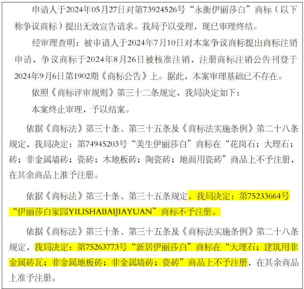 据悉,伊莉莎白近年来持续通过法律途径积极维护“伊莉莎白瓷砖”商标权,依法对市场中使用近似名称的注册申请提出异议并取得阶段性成果。国家知识产权局已对多件与“伊莉莎白瓷砖”相似的商标申请作出不予注册、撤销注册、无效宣告等决定。