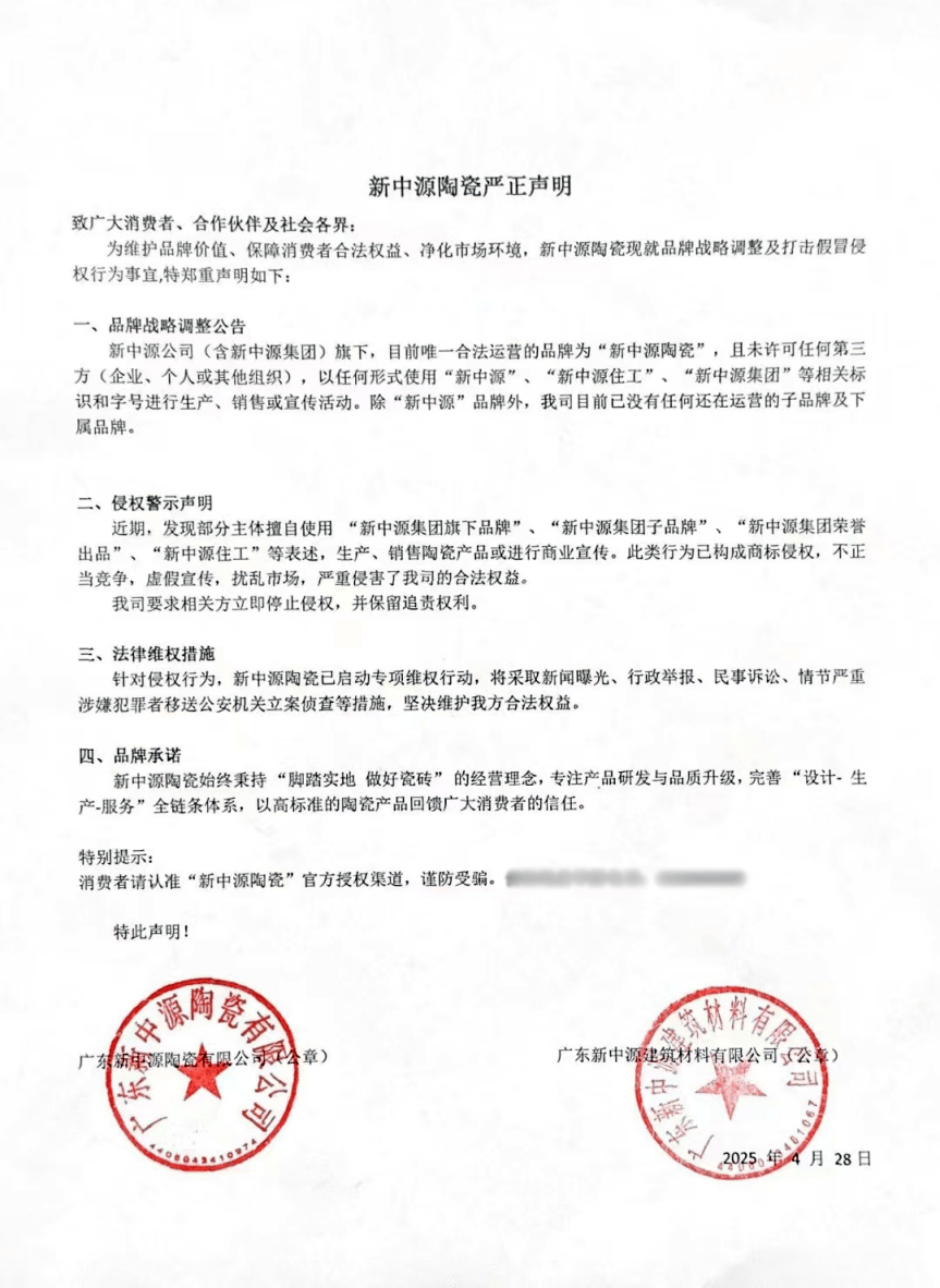 为了维护品牌声誉、打击侵权行为,新中源陶瓷于4月底发布严正声明,称目前唯一合法运营的品牌为“新中源陶瓷”,且未许可任何第三方(企业、个人或其他组织),以任何形式使用“新中源”、“新中源住工”、“新中源集团”等相关标识和字号进行生产、销售或宣传活动。除“新中源”品牌外,公司目前已没有任何还在运营的子品牌及下属品牌。